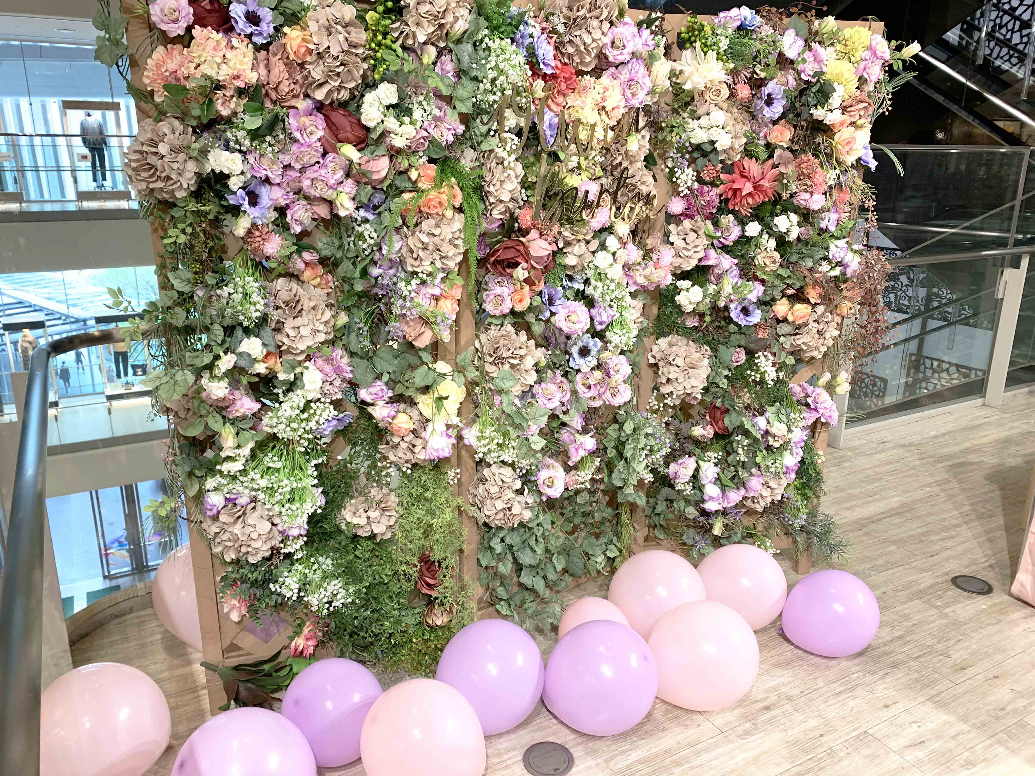ブランドの世界観を感じて欲しい思いを込めて、バルーン&フラワーアーチや、フラワーフォトパネル、そして発売したばかりの新作も並べました!