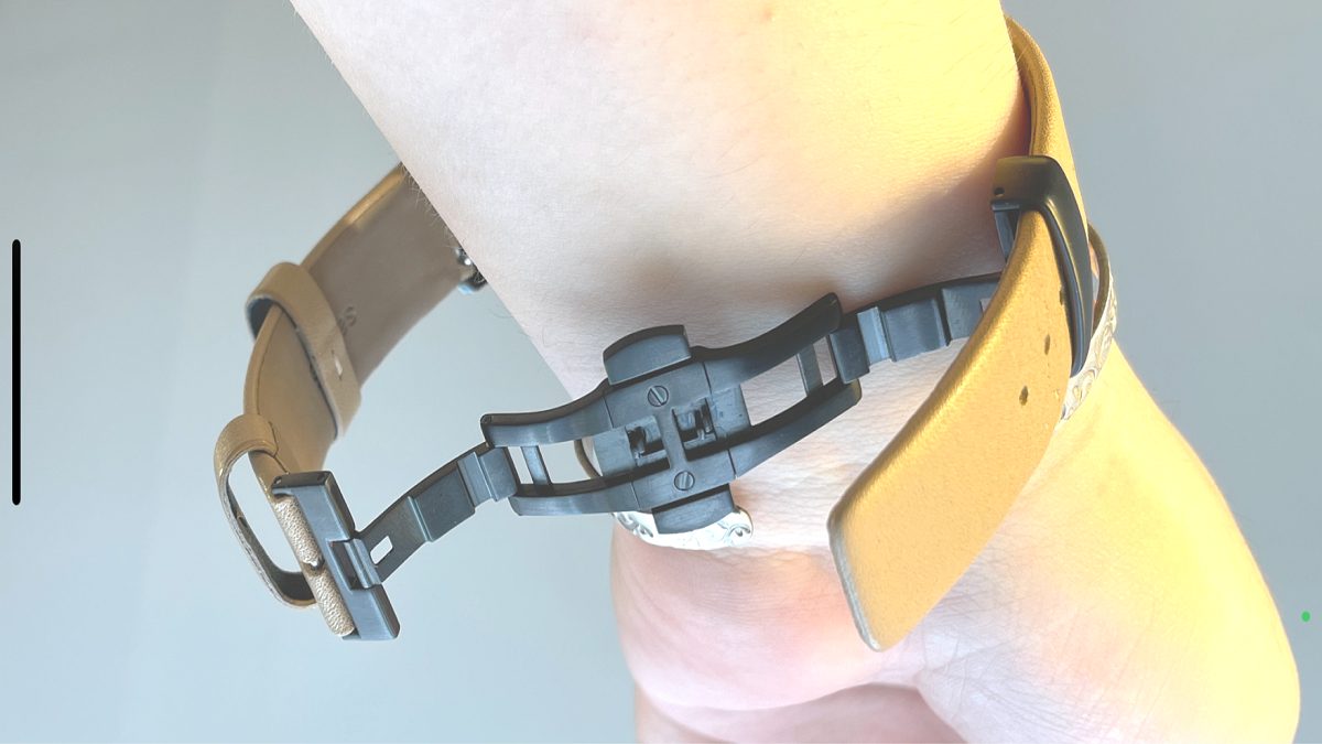 何が良くなるかというと、通常は革バンドの剣先を尾錠に通して、引っ張って装着しないといけないものを省略できるようになります。