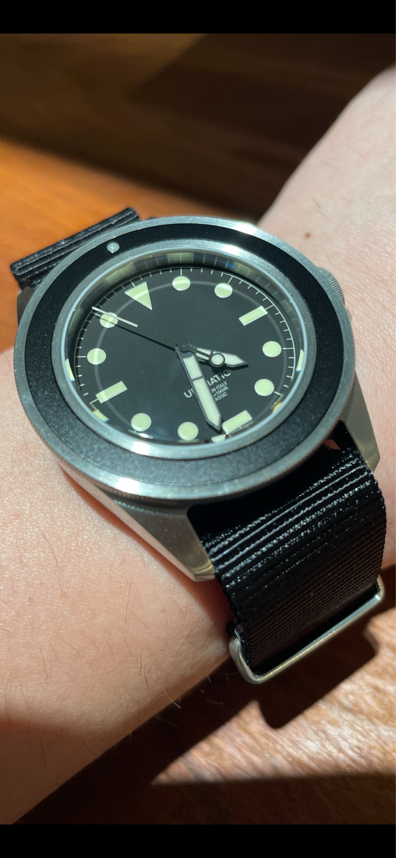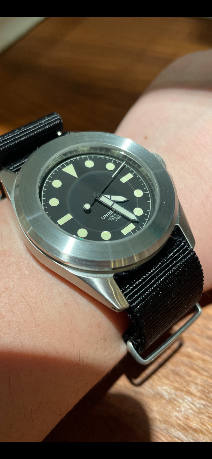 一見ミニマムなケースデザインでサイズ径も38.5mmと小ぶりなこのモデルですが、300m防水、耐磁性能はマストでついているのがUNIMATICの凄いところです。
