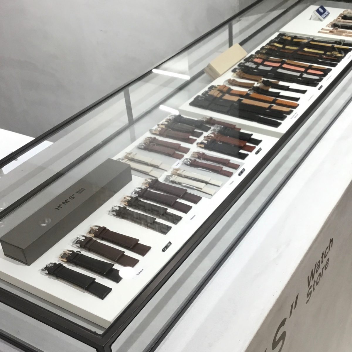 タカシマヤゲートタワーモール店のレジ横スペースには、メーカー別・大きさ別でたくさんの替えベルトを展開しています。