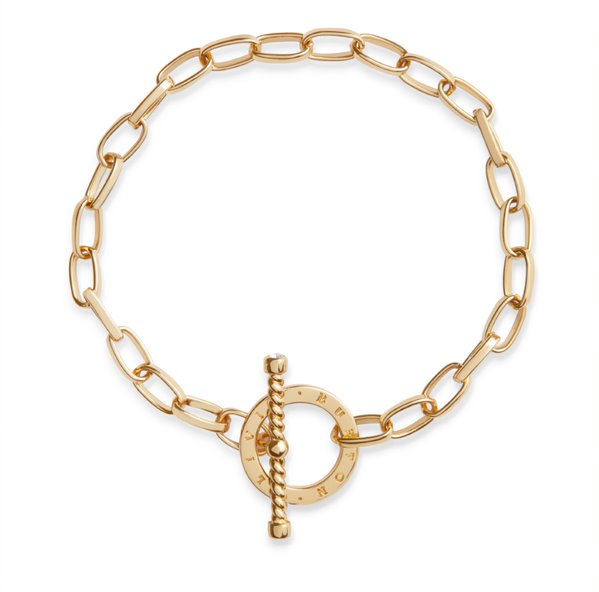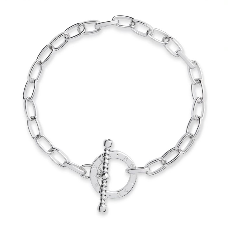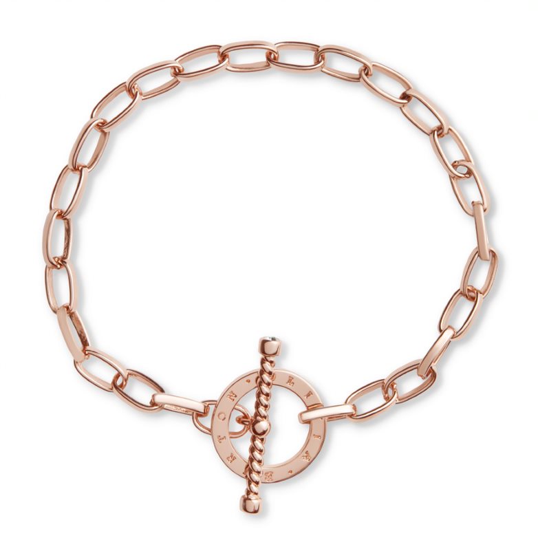 今までの華奢なチェーンブレスレットから、新たに存在感のある太めのチェーンへとアップデート。オリビア・バートンの新たな魅力が光るブレスレットは、ロゴが刻まれたサークルに、スワロフスキークリスタルが両端にあしらわれた可愛いTバーを通して装着するカジュアルなデザイン。