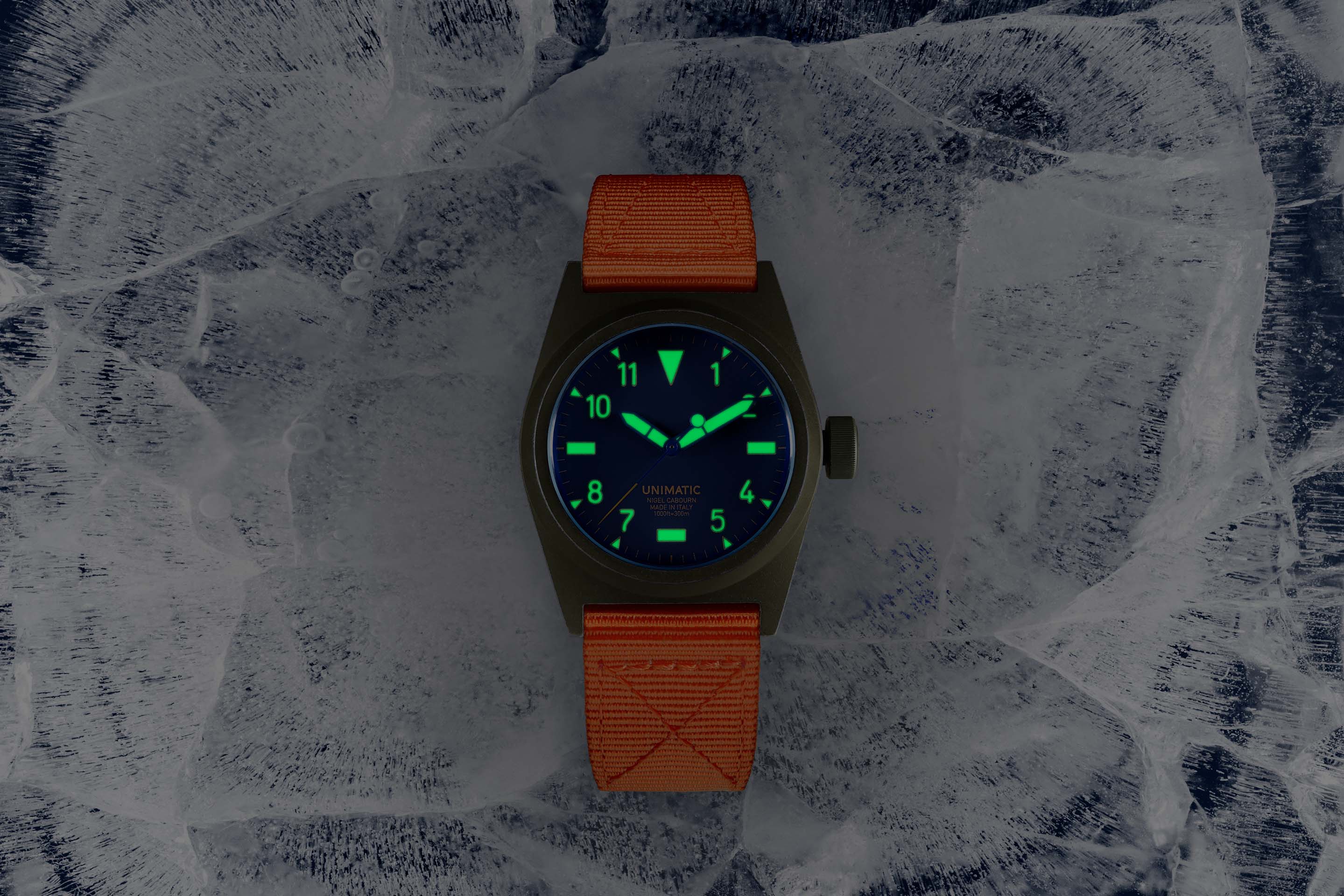ミリタリーウォッチには欠かせない、持続性の高いスーパールミノバ® オールド・ラジウム・ルーメの蓄光インデックスはその光を失うことなく、半永久的に光り続ける。