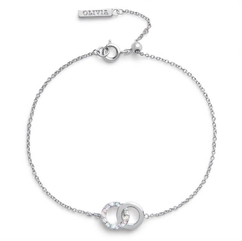 淡いレインボーカラーのストーンが可愛いチェーンブレスレット。シルバー、ゴールド、ローズゴールドの3色展開で登場。