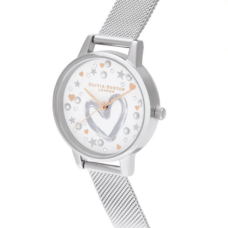 デザイナーが描いた甘いハートのまわりに、星やパールが散りばめられた可愛らしいフェイスデザインにシルバーのボディとローズゴールドの針を採用したモデルと、バレンタインデーの由来となった、愛とミツバチの守護聖人バレンタイン氏の象徴される"Bee(蜂)"を3Dで配したフェイスデザインにローズゴールドのボディとシルバーの針を採用したコンビネーションが大人っぽいモデルの2品番が発売される。