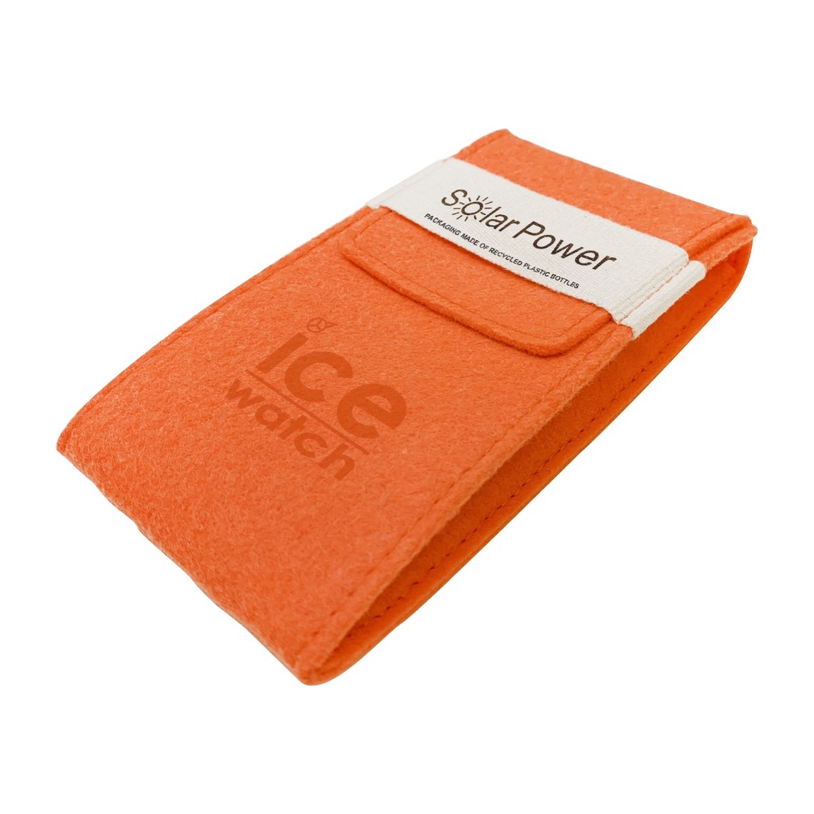 ブランドカラーのオレンジに染められた等モデルのパッケージは、地球環境に配慮したリサイクル素材であるペットボトル等の再生繊維を混合してつくられる硬貨フェルトで製作。持ち運びに便利なウォッチケースとなるのはもちろん、メガネケースやペンケースとしての活用も可能。